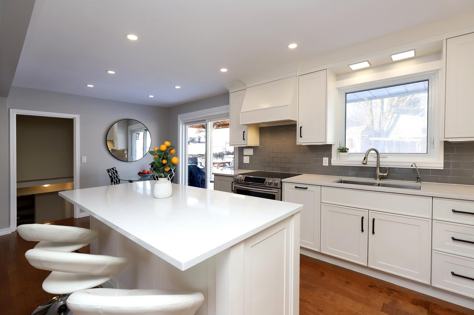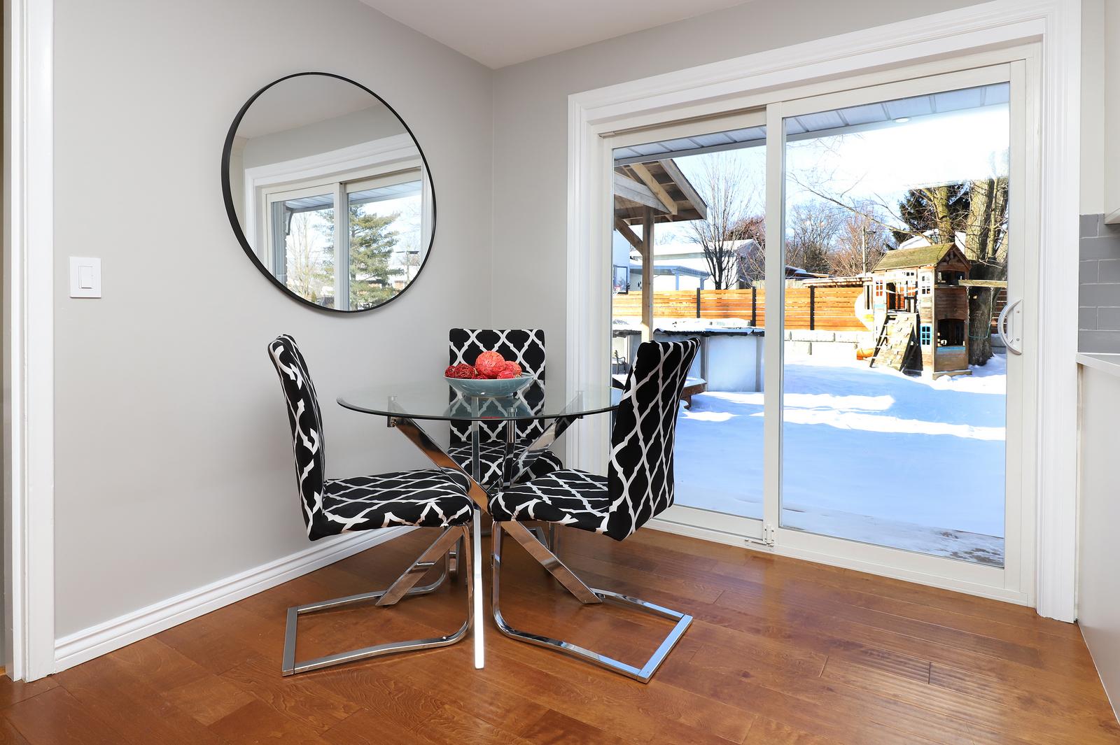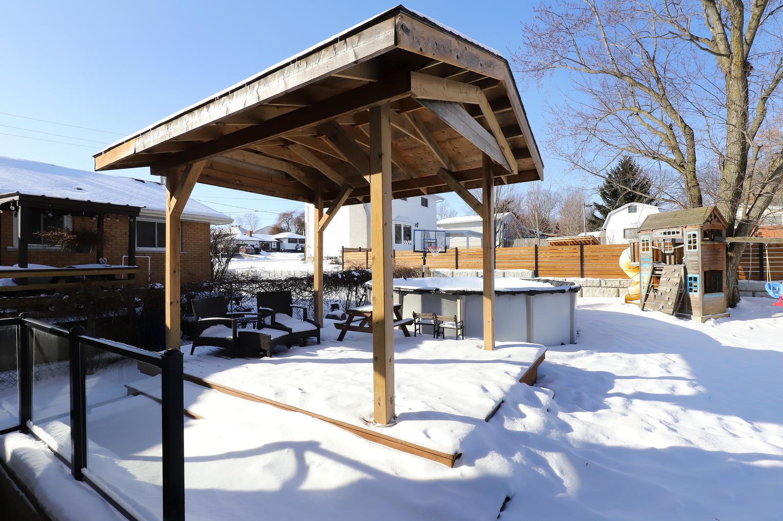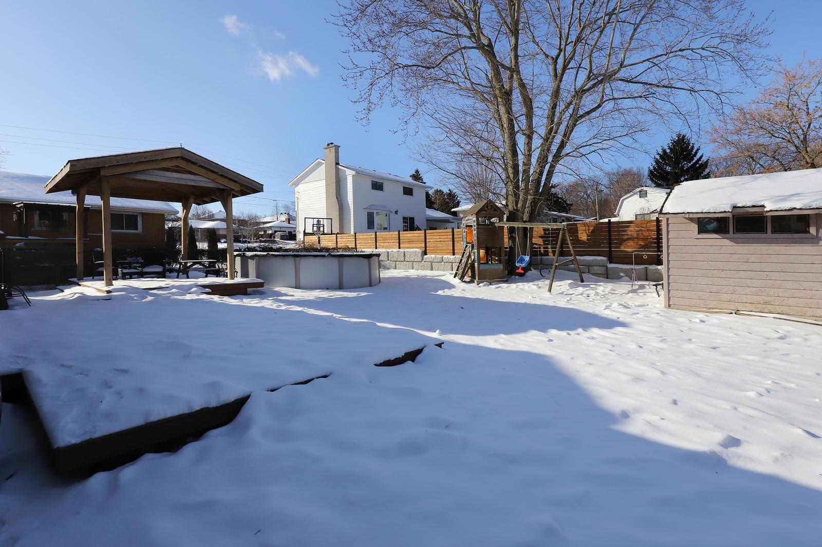 The upper-level features three bedrooms and a newly renovated bathroom (2025). The main floor boasts a bright, open concept living and recently renovated kitchen area (2020) with a walkout leading to the spacious backyard. The lower level includes a spacious family room with a separate entrance that opens to a beautifully landscaped yard complete with an oversized gazebo, above-ground pool (2024; pump 2025), shed, retaining sidewall stonework and fence (2022), and a charming playhouse. Perfect backyard for entertaining and family fun.